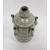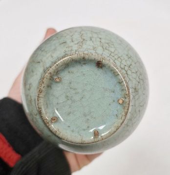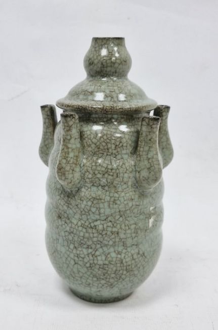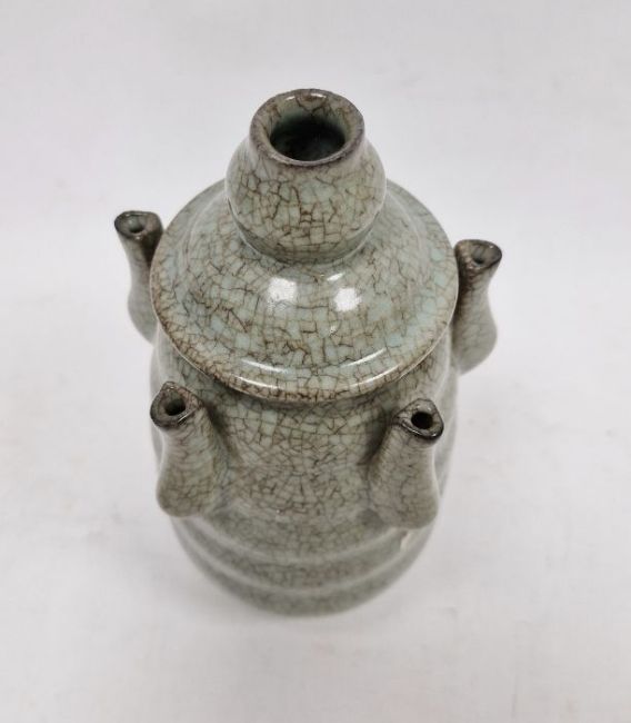 20th century Chinese flower stem vase in a pale ground celadon crackle glaze, the central stem surrounded by five smaller stems, on circular foot, 18cm
