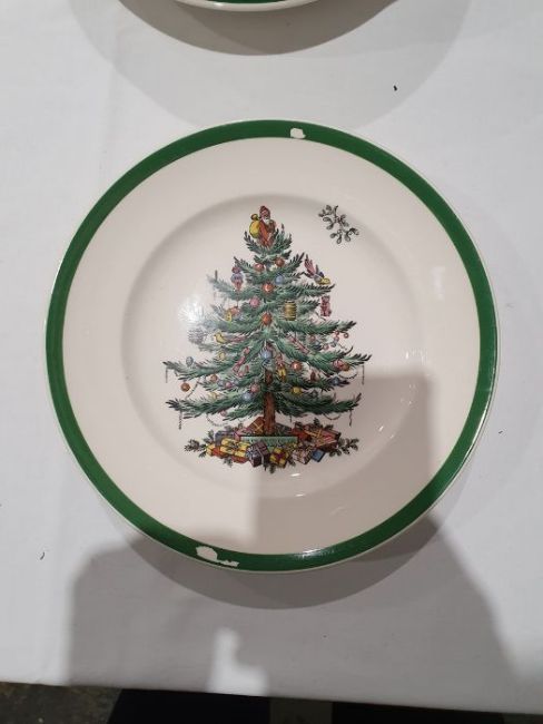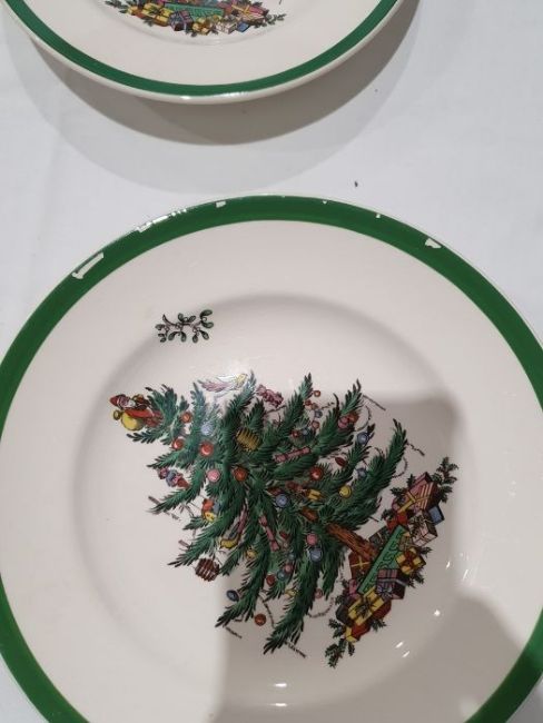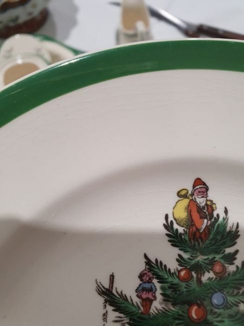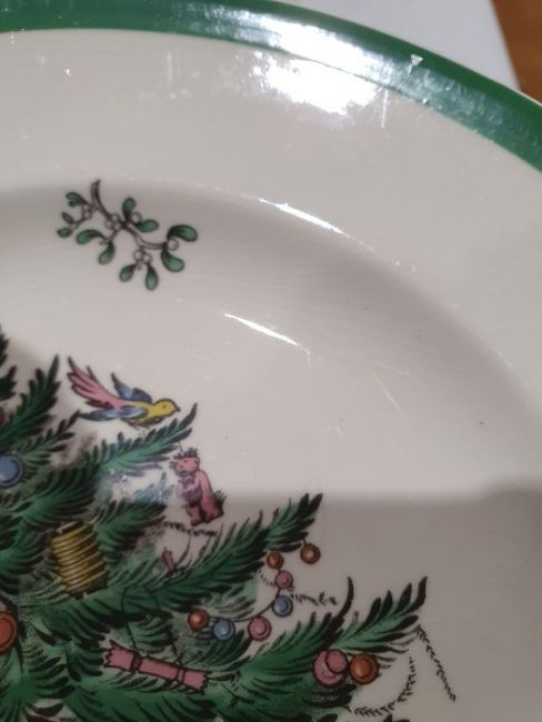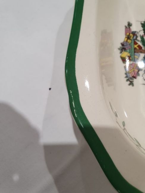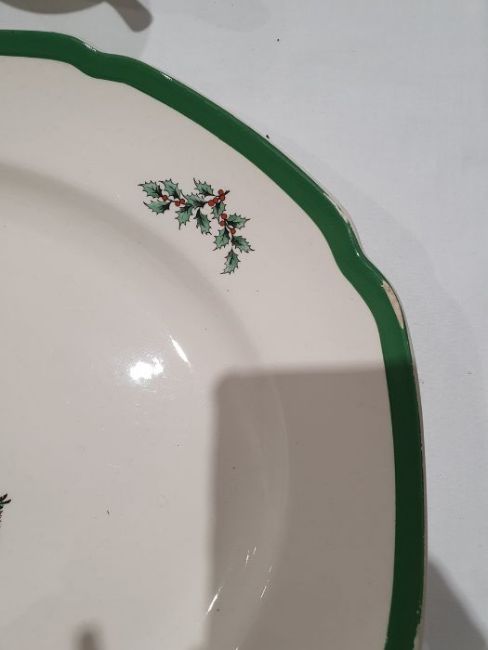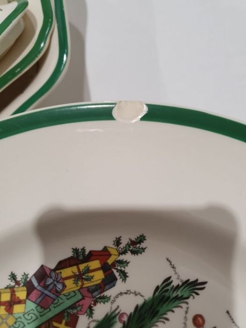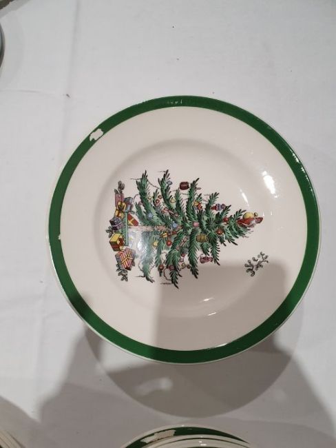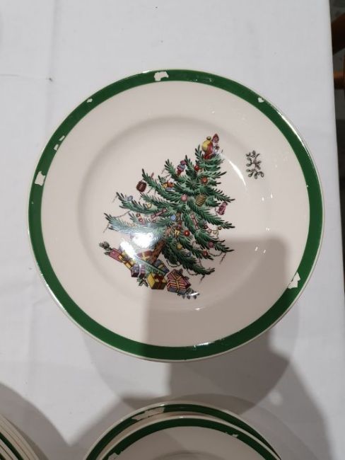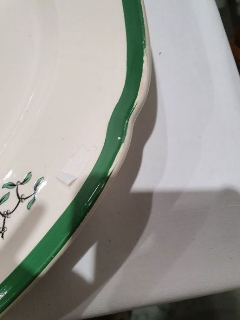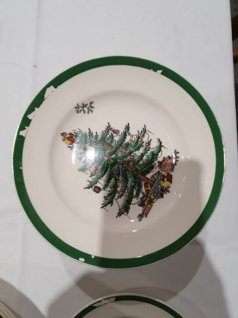 All pieces with light surface scratches and wear, some with crazing. Creamer with small chip to rim, chip to one dinner plate, tea cup with crack and old repair. Many with areas of loss to the green banding. General wear and tear.