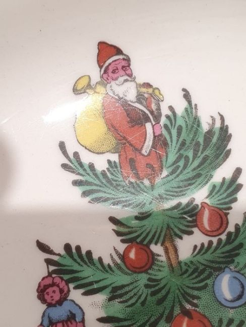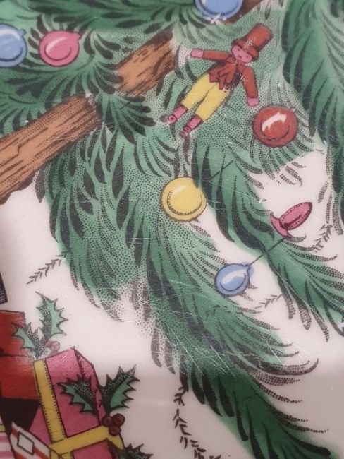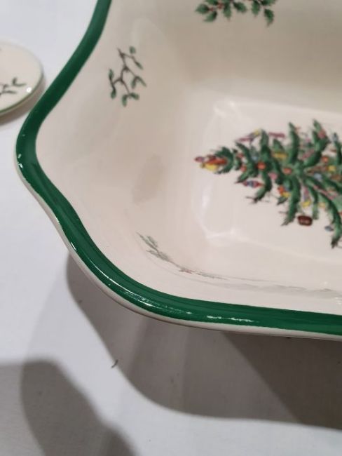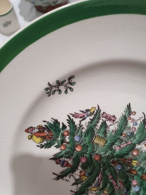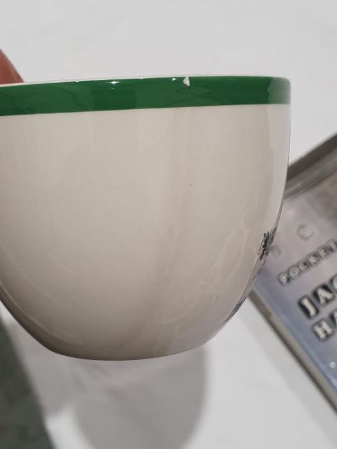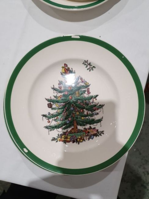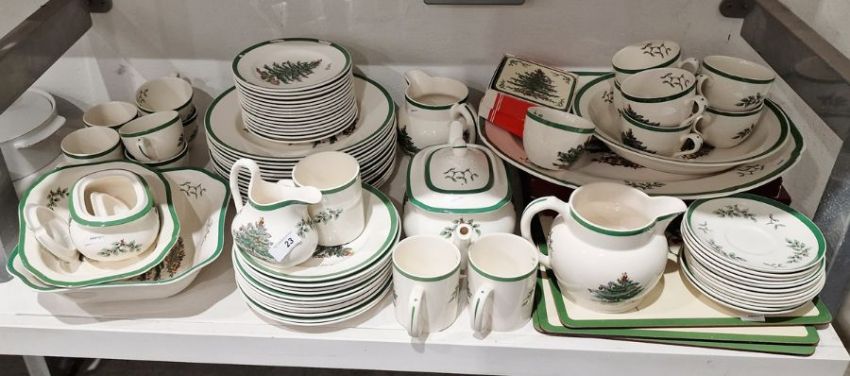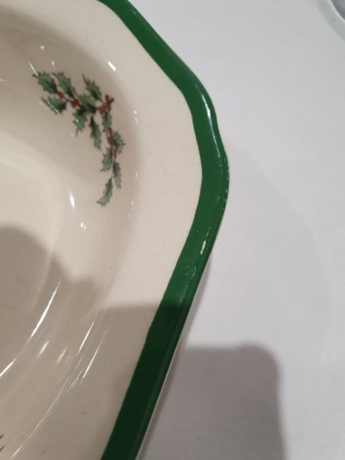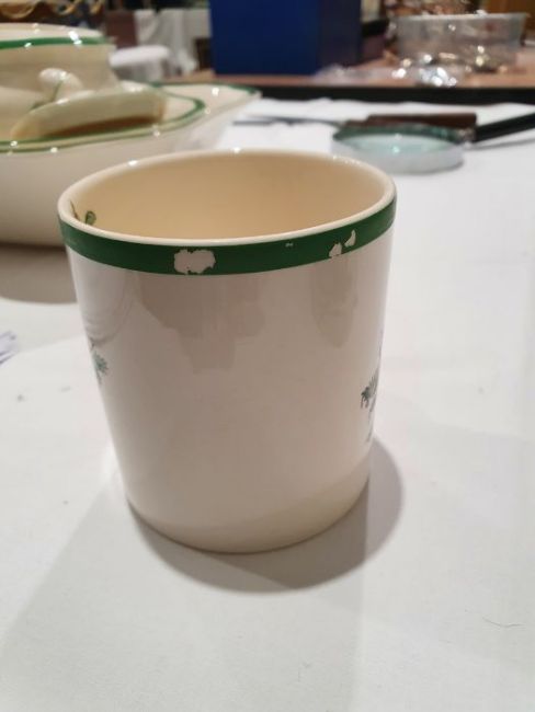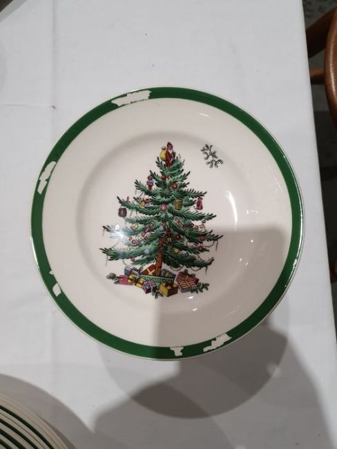All pieces with light surface scratches and wear, some with crazing. Creamer with small chip to rim, chip to one dinner plate, tea cup with crack and old repair. Many with areas of loss to the green banding. General wear and tear.