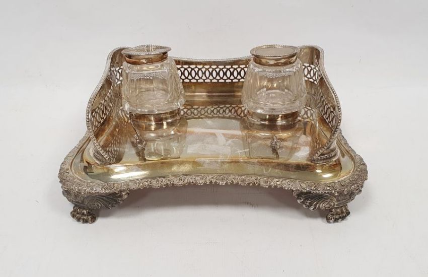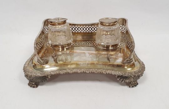 George III silver inkstand with two glass and lidded silver inkwells, the shaped rectangular stand with pierced back, on claw feet, London 1817, maker Edward Farrell, the stand 22ozt approx. (not including glass inkwells), 24.5cm wide approx.