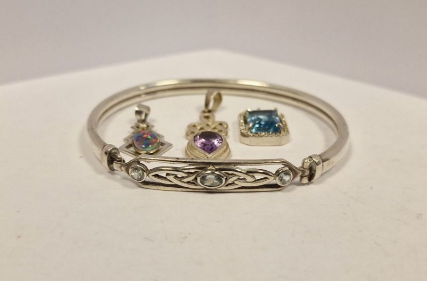 Silver Celtic-style gemstone bangle and three gemstone pendants