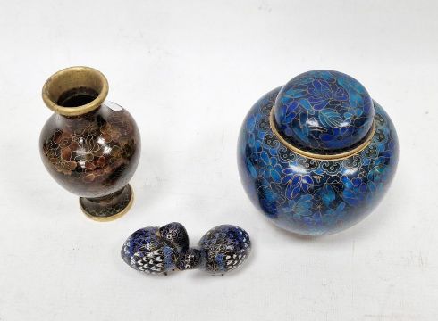 Four items of Chinese cloisonne to include ginger jar, two quails and a vase