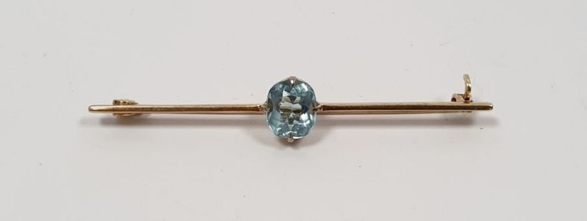 15ct gold and aquamarine set bar brooch, 2.5g approx.