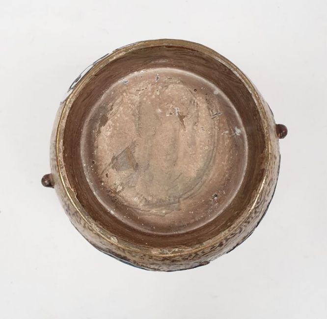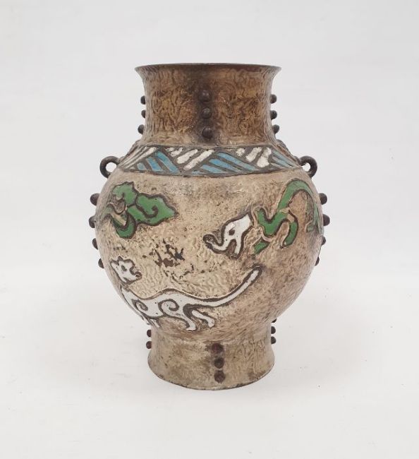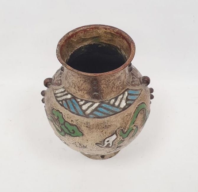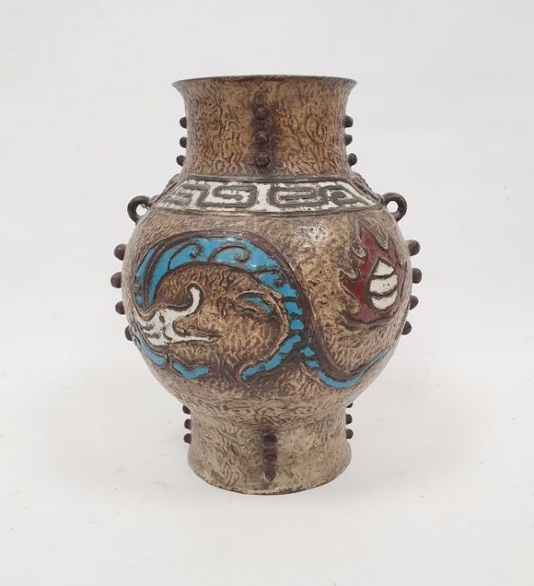 Chinese archaic style metal and champleve enamel vase, the body with stylised dragon decoration, the whole on circular foot, 25 cm tall