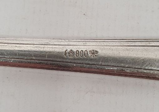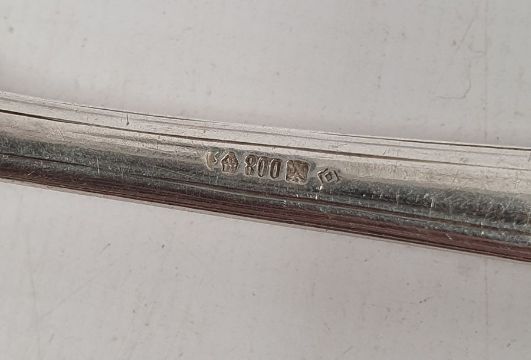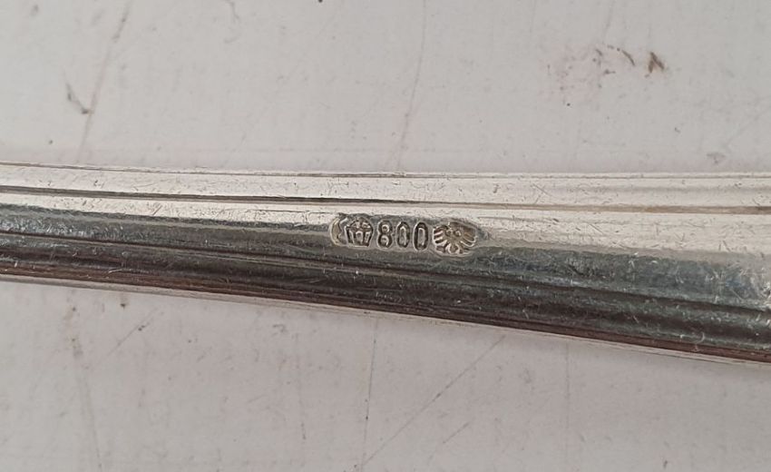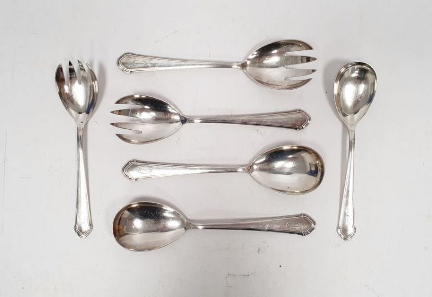 Two large and one small German silver salad server sets with engraved handles, all marked with crescent and crown mark and 800, larger servers 21cm, 5ozt approx. each, smaller servers 18.5cm, 3ozt approx. (6)