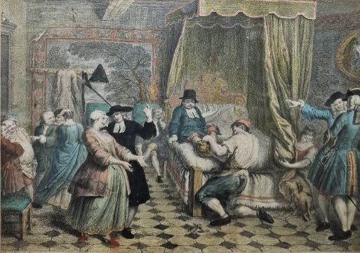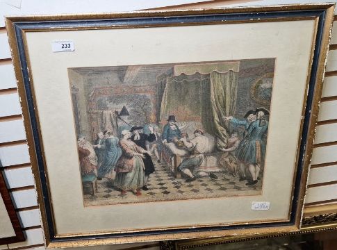 After Louis De Surugue (1686-1762) Coloured engraving "Un Serrurier Coupe le Pot de Chambre pour Degager le Pied de Ragotin", 25cm x 35cm