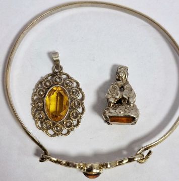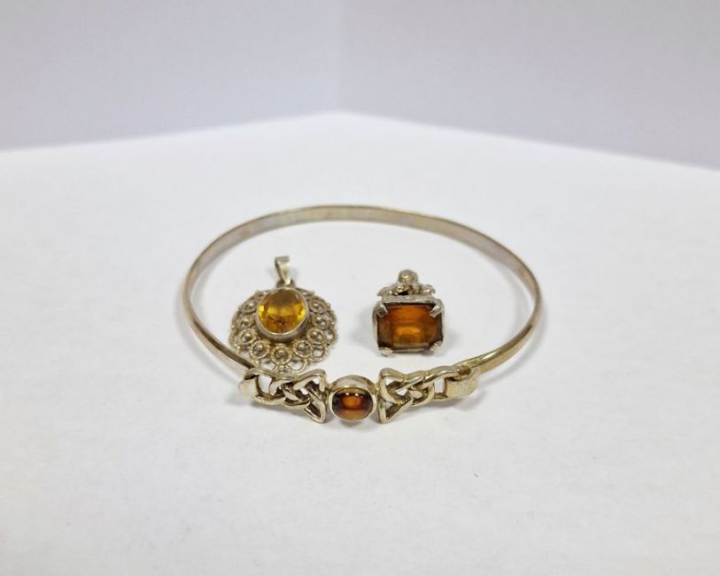 Collection of silver jewellery to include a Celtic-style tiger's eye bangle, gemstone pendant and gemstone fob pendant