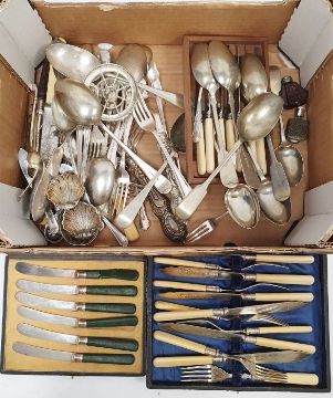 Quantity of plated flatware, some cased sets, teapot, two-handled sugar bowl and milk jug (1 box)