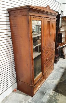 Edwards & Roberts Edwardian walnut compactum with shaped cornice to two cupboard doors, above three long drawers flanked by mirrored wardrobe door to the left hand side, above two drawers, 208cm x 156.5cm x 55cm