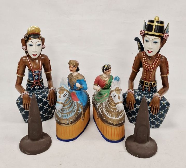 Pair of Eastern wooden carved seated figures and two Eastern papier-mache models of male and female on horseback