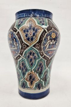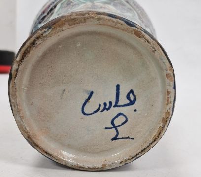 Middle Eastern inverse baluster vase with panelled decoration, indistinctly signed to base, 27cm high