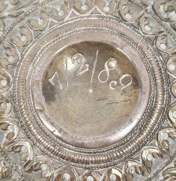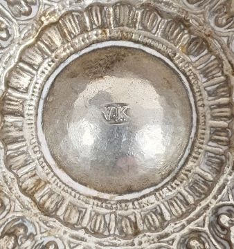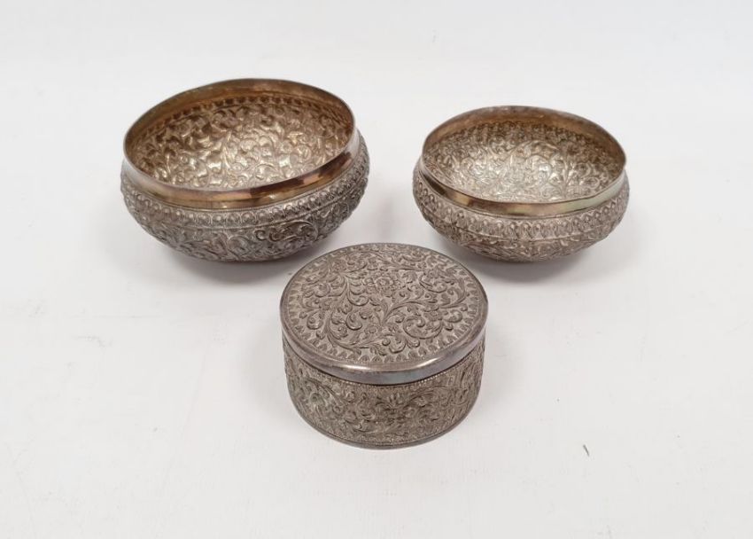 Silver-coloured metal foliate repousse circular bowl, marked '7/2/89' to base, 10cm diameter approx. a similar smaller bowl marked 'V.K' to inside, 9cm diameter approx. and a similar circular lidded trinket box (3)