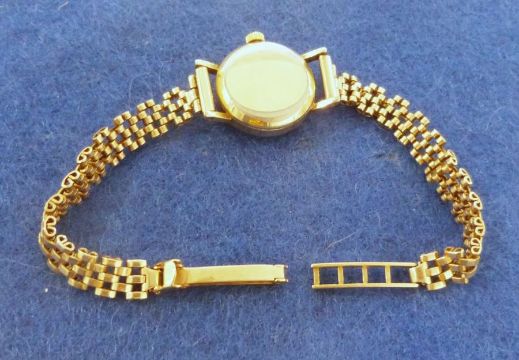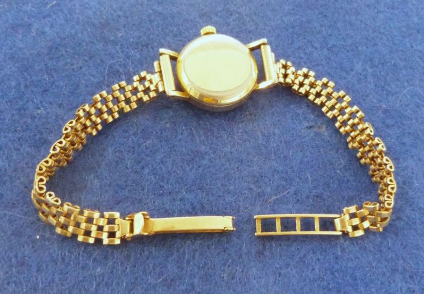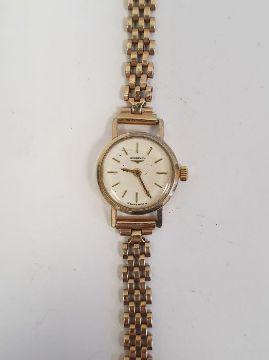 Lady's Longines wristwatch with gold coloured case, baton numerals and side button and the 9ct gold chain link bracelet