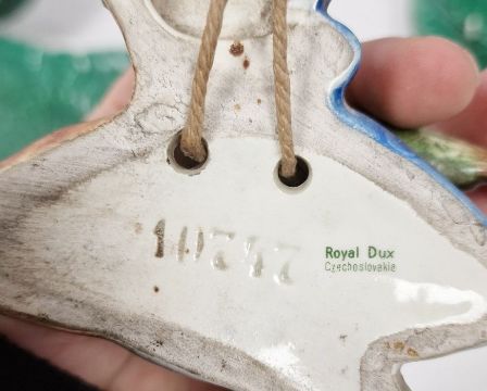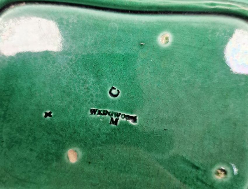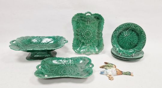 Wedgwood majolica leaf plates, tazza, serving dishes and a Royal Dux wall-hanging mallard duck