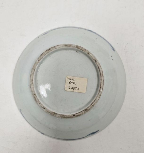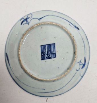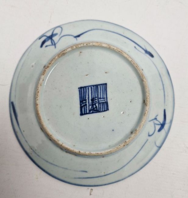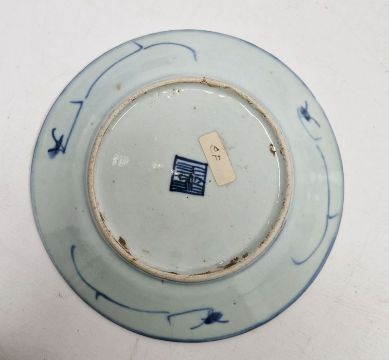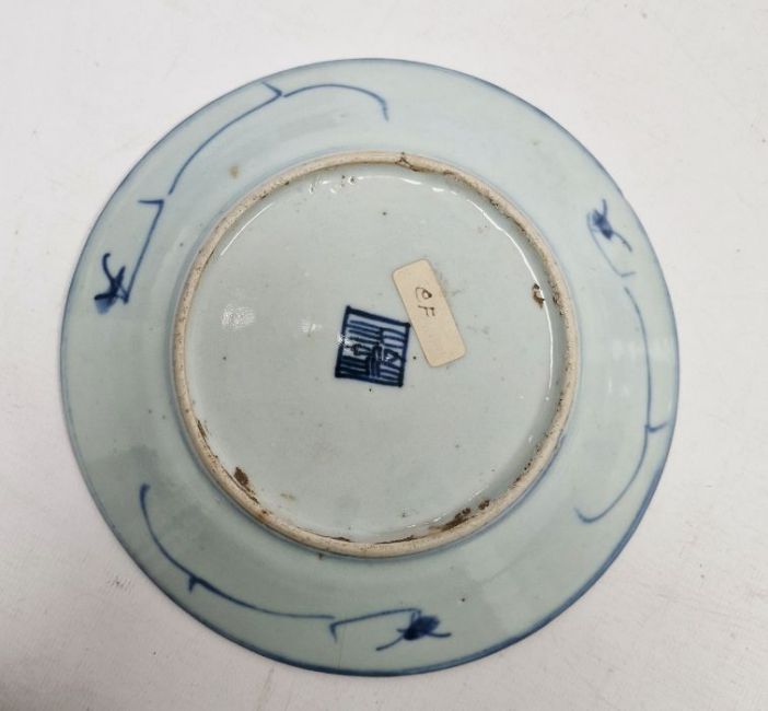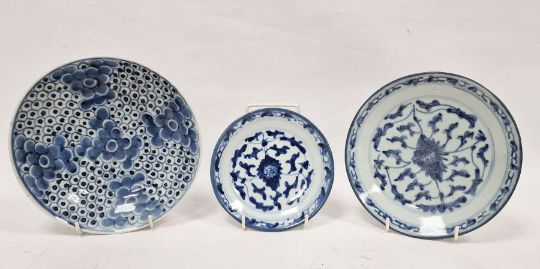 Three assorted Chinese blue and white plates to include two similar with seal marks to base and a further unmarked dish with circular decoration (3)