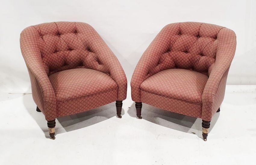 Pair of modern 20th century office reception chairs with button backs and plum floral upholstery on turned front legs to castors