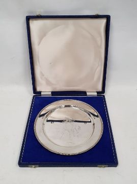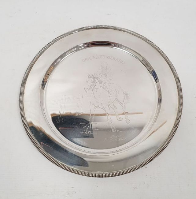 Limited edition silver plate no.1140/2000 designed by Doris Lindner, in commemoration of the achievements of Brigadier Gerard 1970-72, signed, London 1973, makers RC, 23cm diameter, 8ozt approx. with limited edition certificate, boxed