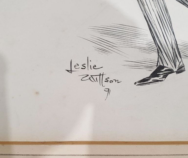 "Dishonest Johnes", parading couple, signed and dated 91 lower, inscribed back 'Reduced 5 1/4" wide Dishonest Johnes', 'Hurry Up My Dear! If Johnes Overtakes Me He'll Want to Borrow this Umbrella and I can't Twist Him to Disown It, Isn't He Honest Then Papa', 'He Wouldn't Be So This Time, This is his Own Umbrella You See', 28cm x 25cm