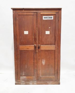 20th century stained pine two-door wardrobe with rectangular top over two panelled doors, on plinth base, 176cm x 109cm x 38cm