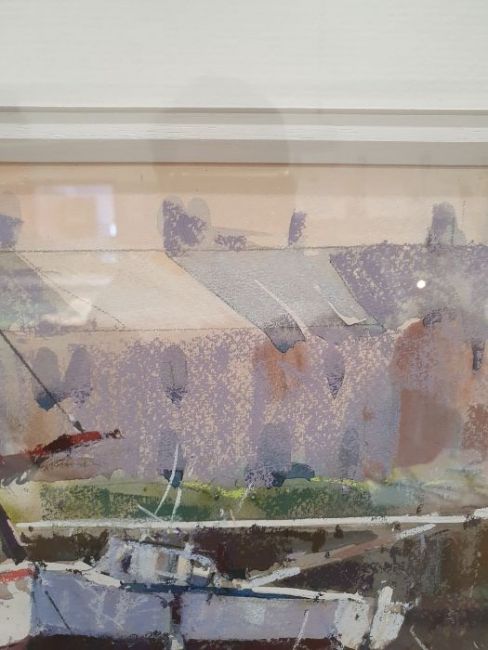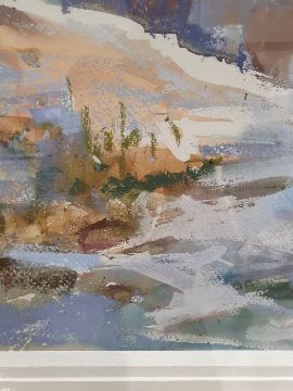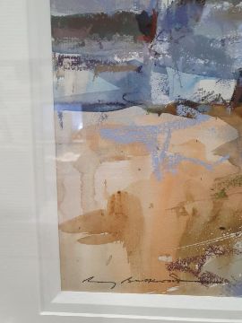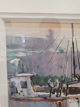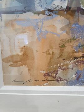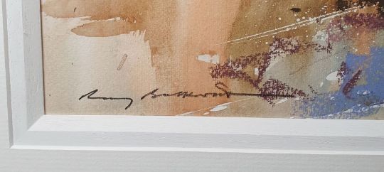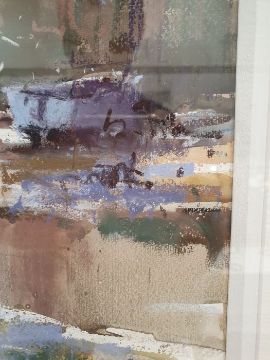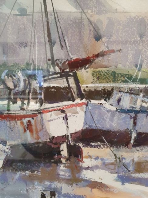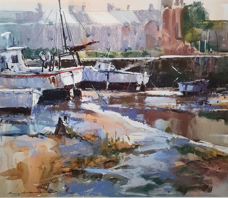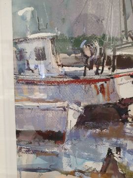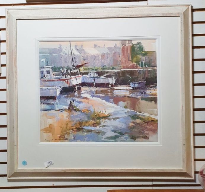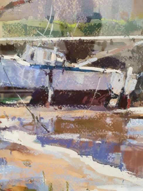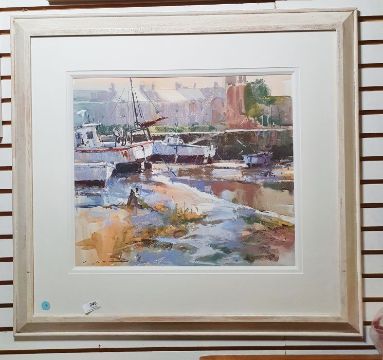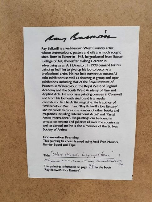 Ray Balkwill Mixed media"Wet Mud, Lympstone" coastal scene with moored boats at low tide, bears artists label verso, signed lower left, 40cm x 46cm Condition ReportGood overall condition, no obvious signs of damage, fading, restoration or overpainting.  General wear and tear.