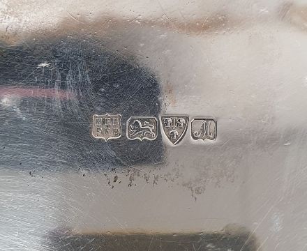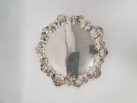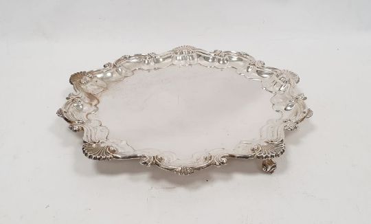Early 20th century salver with scalloped edges, on three feet, Chester 1912, maker Baker Bros, 26ozt approx.