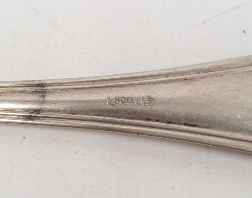 Set of early 20th century German J.A.Henckels Solingen table forks and knives, marked 800, viz:- nine forks, seven knives with silver handles and a matching larger fork, initialled to handle,  25ozt total approx., a silver-coloured metal spoon and a pair of silver teaspoons