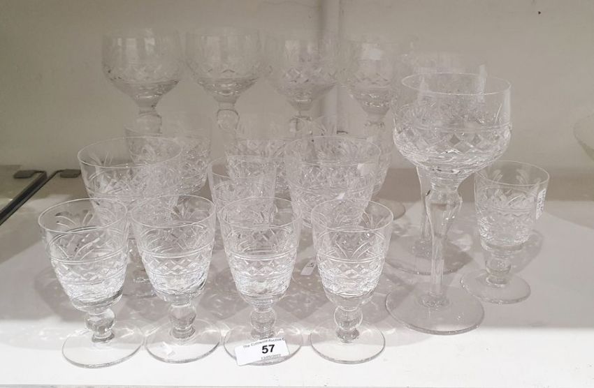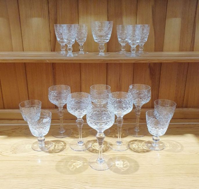 Stuart cut glass part-table service, etched marks, comprising six large wine glasses, five smaller wine glasses with conical bowls and six smaller sherry glasses