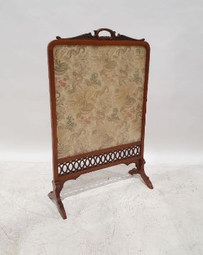 Late 19th/early 20th century needlework fire screen, the top with incorporated finial and acanthus leaf decoration, with needlework behind plexiglas, on interlocking frieze, end supports, 99cm x 63cm x 25.5cm
