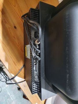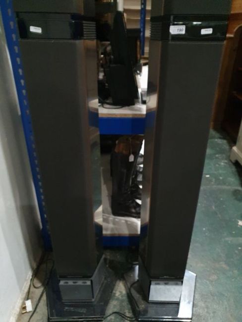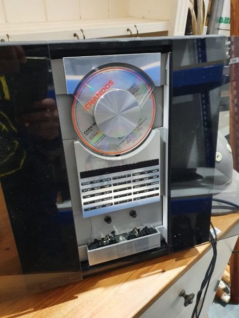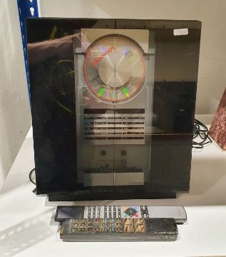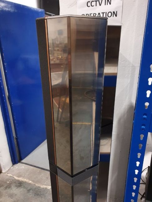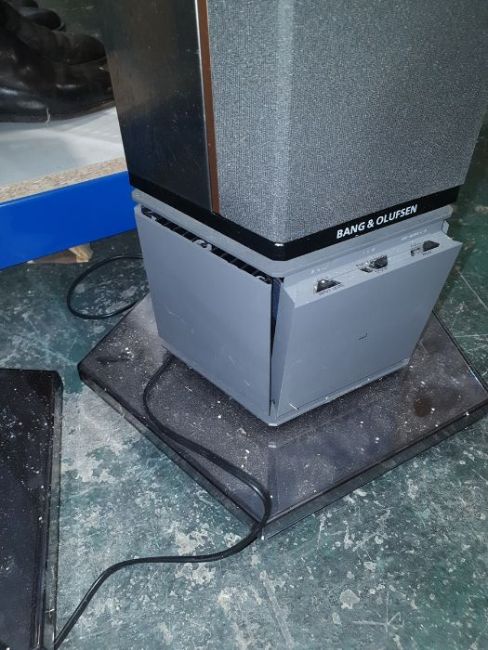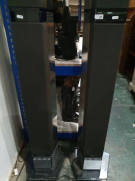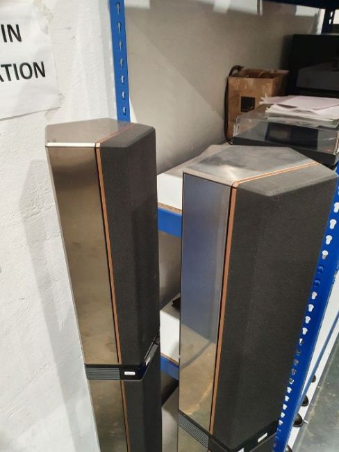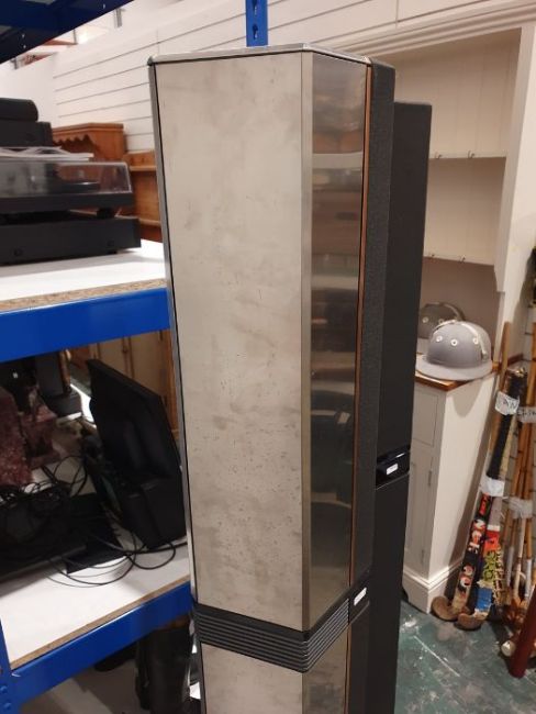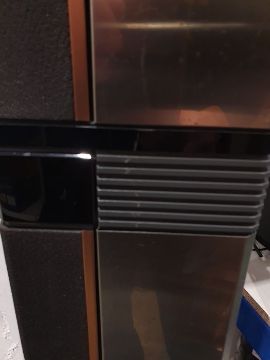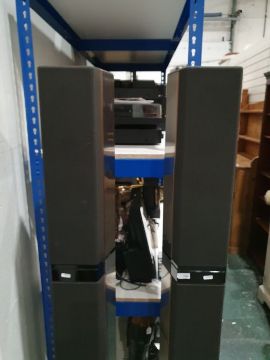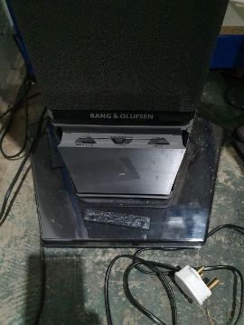 Light surface scratches, marks and scuffs on the speakers, accretions and a some tarnishing to the metal casing, Plastic base on one is loose and has come away from the base. Cd player with surface marks and accretions. Unable to say whether items are in working order. General wear and tear.