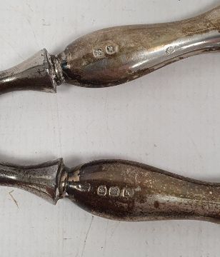 Early 20th century silver-mounted trumpet-shaped vase, Chester 1911, 20cm high, some silver-handled glove stretchers and a small circular silver trinket box (3)