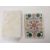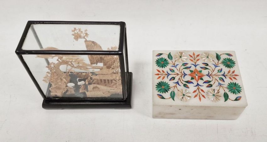 Miniature painting, oval, on mother-of-pearl, of figures on horseback, a hardstone inlaid lidded rectangular alabaster box and a cork scene in five-sided glass case (3)