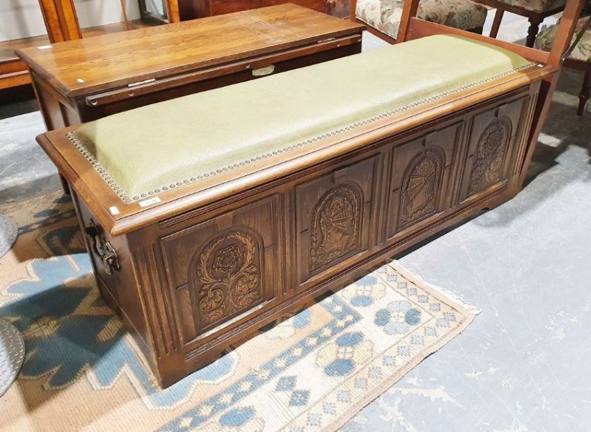 20th century oak coffer with padded leather top with carved floral and knight's helmet panel by Jaycee Furniture Limited, Brighton, height 51cm, length 138cm, depth 46cm