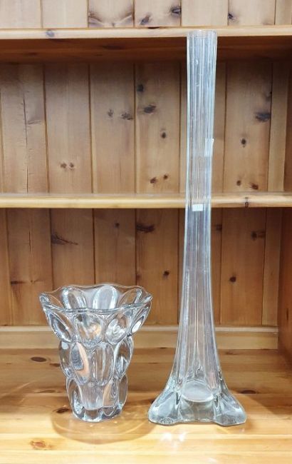 Mid-20th century Vannes France clear glass vase with raised exterior oval bubbles, 19cm high and a tall clear glass stem vase with tricorn base, 56cm high (2)