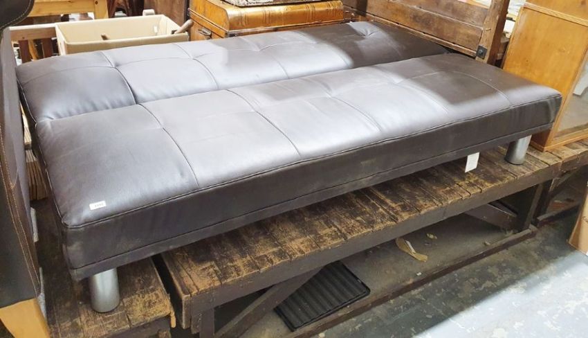 Modern faux-leather sofa bed with reclining back, on chrome-style feet