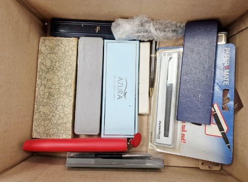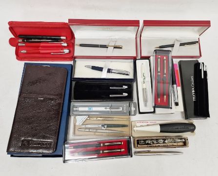 Box of assorted pens to include fountain pen marked 'The Roxley Pen, a Dickinson Product' other pens by Sheaffer and Parker etc.