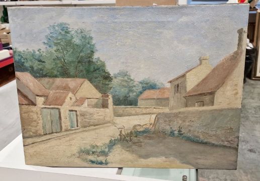 20th century French school Oil on canvasVillage scene, indistinctly titled and attributed to label verso, dated 24th June 1961, unsigned, 41cm x 55.5cm