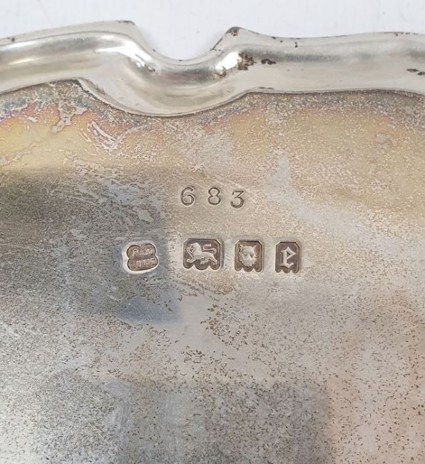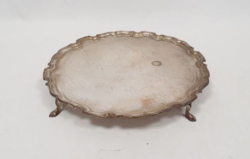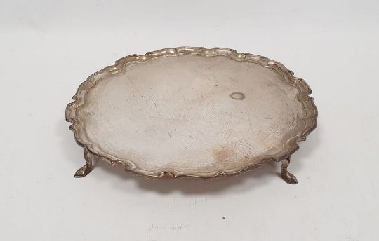 1920's silver salver, circular shaped with scalloped edge on spade feet, London 1920, maker Pearce & Sons, 18ozt total approx., 25cm diameter approx.