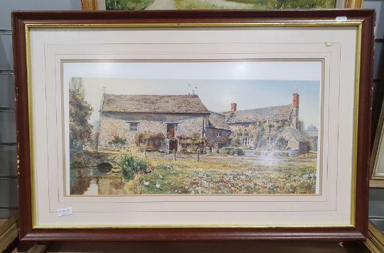 J E Halliday - 20th centuryOil on boardRural landscape with dwellings, signed and dated 1983 lower right together with E Fraser - 20th centuryWatercolourLake scene with mountains in  background, signed lower right and further assorted prints and picture frames (9)