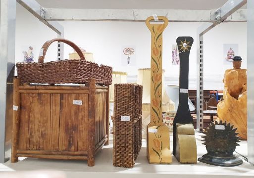 Three doorstops including one in form of stylised sun, bamboo planters and handled basket etc and a chess board
