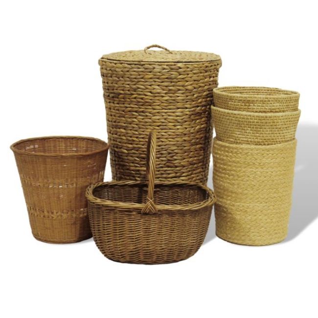 Wicker clothes basket, a wicker basket and four wicker bins (6)