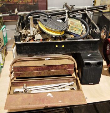 Quantity of tools to include hammers, screwdrivers, pliers, chisels, planes, a tow rope, a pair of Sony speakers and a cantilever toolbox containing sockets and spanners etc, easel and foot pump (3 boxes)
