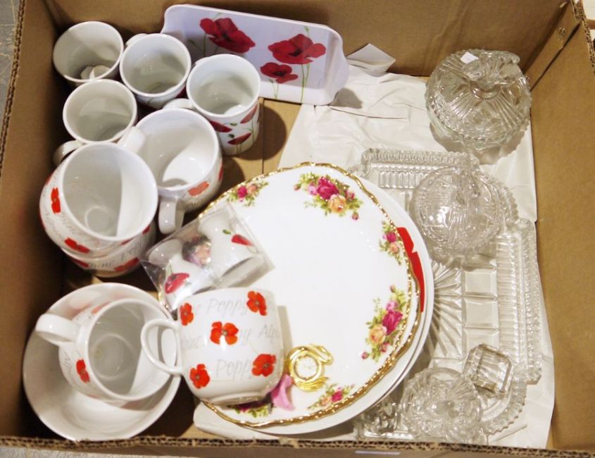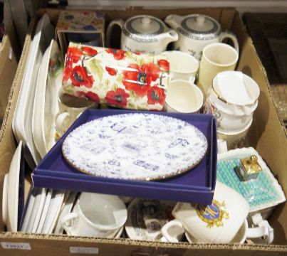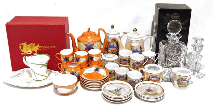 Art Deco-style Phoenix china part tea service to include teapot, creamer, cups and saucers, two Woods pottery 'Indian Tree' pattern teapots, a Bohemia crystal cut glass decanter, a Sadler 'Championships the Tennis Match' novelty teapot and assorted china and glassware (2 boxes)