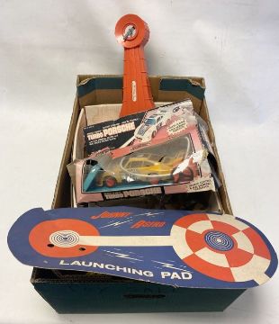 Johnny Astro Moon Probe, four vintage puzzles to include House of Games Waddington's Star Wars 'Entering The City', House of Games Waddington's Star Wars 'Inside the Millennium Falcon', Whitman 7836 Doctor Who, The Professionals, Dinky Toys Striker and a Playmates battery operated Turbo Porsche, etc (one box)