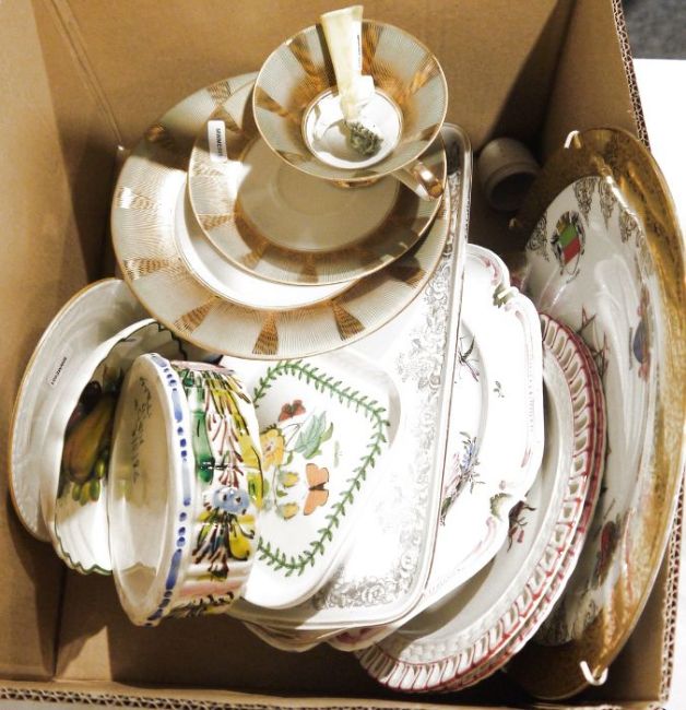 Pair of Nikon 8x23 binoculars, a vintage Halina colour slide viewer, various leather camera and binocular cases, a pair of brass pans and assorted chinaware (2 boxes)