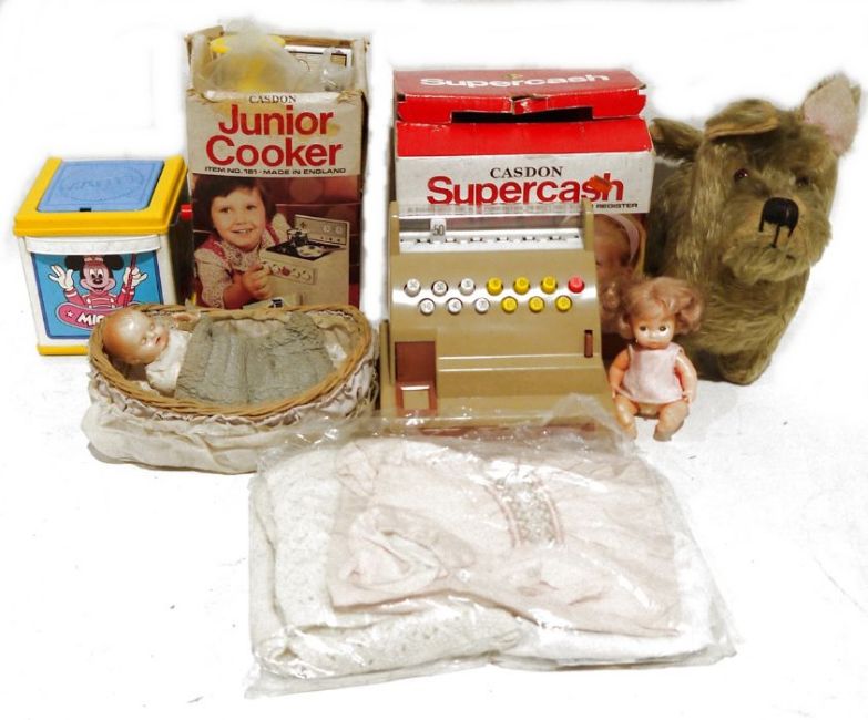 Vintage Mattel Disney Jack in the box, a Casdon Supercash childs toy till, a Casdon Junior cooker and assorted soft toys, dolls, etc (1 box)