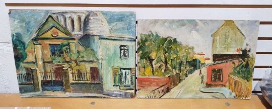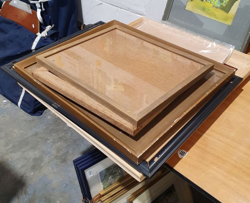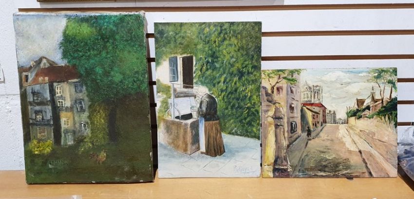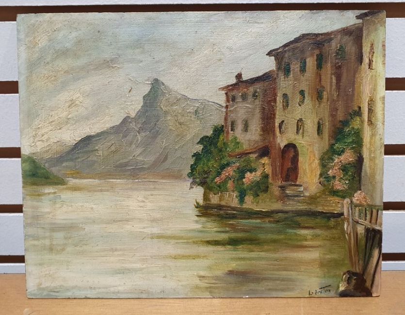 Continental landscape featuring a river with dwellings in the foreground, mountain in the distance, signed lower right, together with assorted paintings, prints and frames (19)