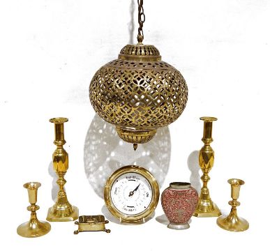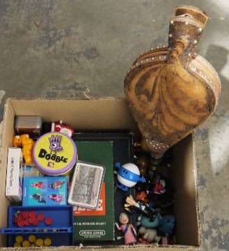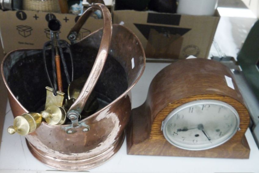 Copper coal bucket, a pair of brass candlesticks, another pair of smaller brass candlesticks, a pierced brass ceiling light, an oak-cased mantel clock, assorted wind-up toys and board games to include Scrabble, Trivial Pursuit and assorted metalwares and toys (2 boxes)