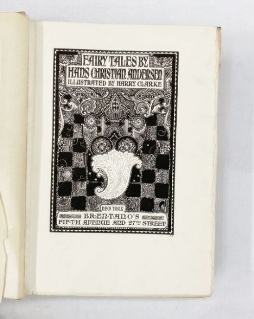 Clarke, Harry (ills) "Fairytales by Hans Christian Andersen", Brentano's New York [1916], colour frontis tipped in, lettered tissue guard torn and creased but no apparent loss, decorated tp, all colour and black and white plates present as required, lettered tissue guards to colour plates, deckle edges, top right hand corners of all pages with dark marks, inked name and date School of Art Dublin 1921, grey cloth, pictorial boards, backstrip sunned, some slight staining to front board, pictorial pastedown to front board