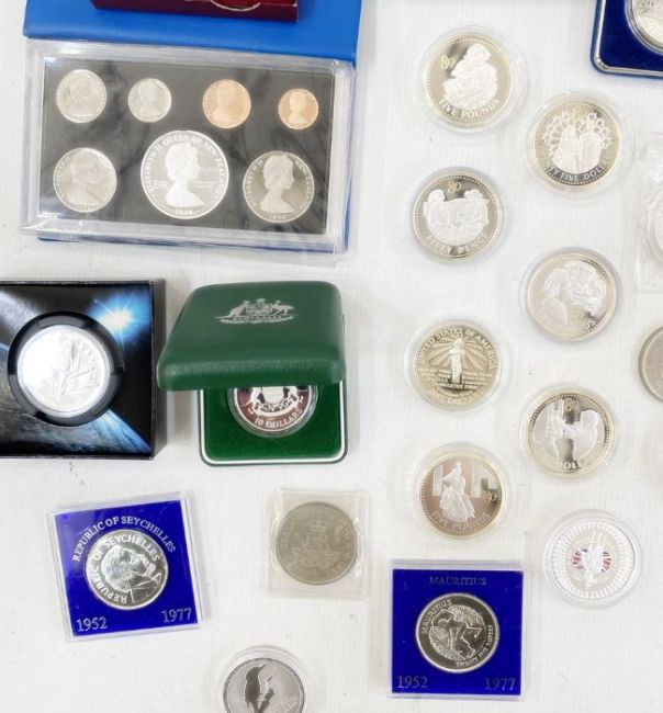 Tin box of mainly silver proof coins (world), small amount of nickel coins