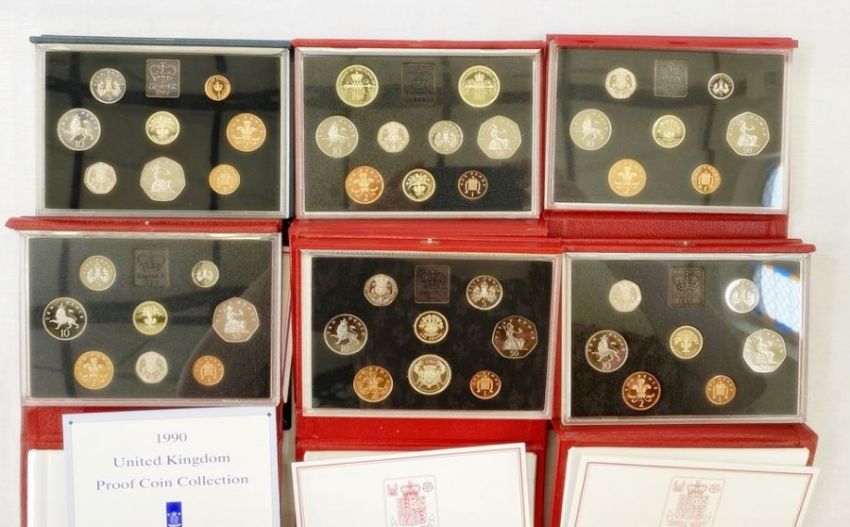 Proof sets United Kingdom (6), 1 blue case 1984 and 5 leatherette sets, 1986, 1987, 1989, 1990 and 1991